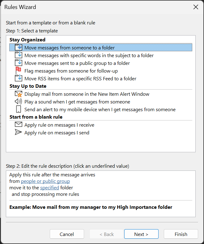 Here we can see a group of helper templates to quickly create a rule. In our case, we want to automatically move messages based on the email subject. We selected the template “Move messages with specific words in the subject to a folder”