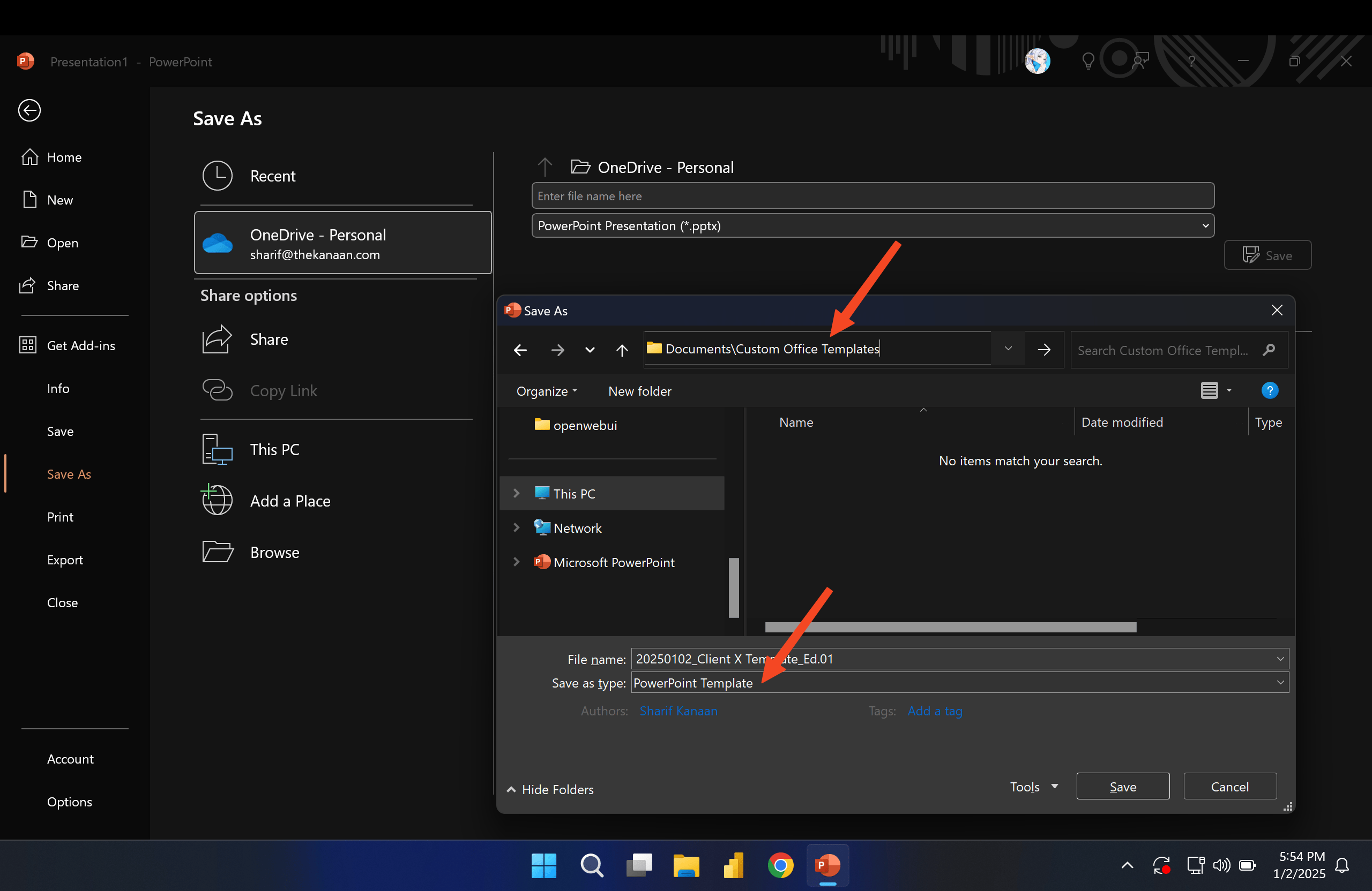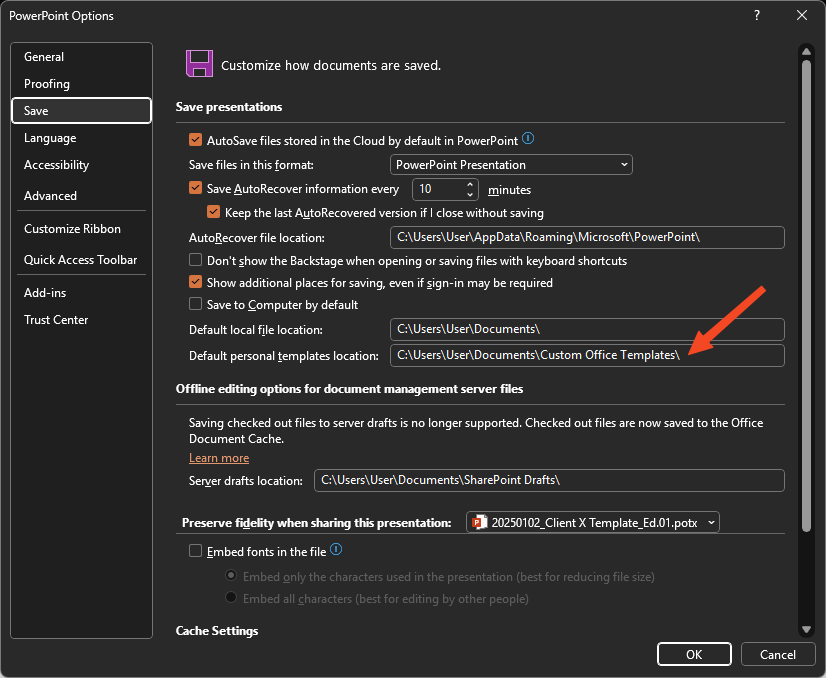 To configure the template, you need to set the default personal templates location within settings to the aforementioned Custom Office Templates folder.